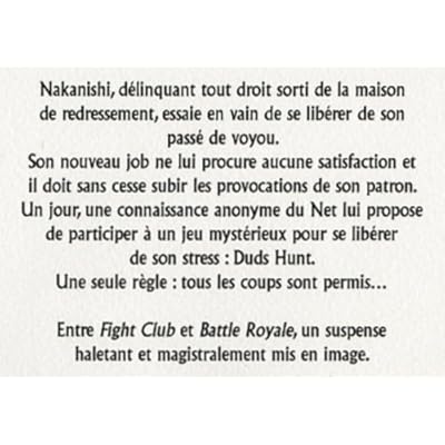 Nakanishi, délinquant tout droit sorti de la maison de redressement, essaie en vain de se libérer de son passé de voyou.Son nouveau job ne lui procure aucune satisfaction et il doit sans cesse subir les provocations de son patron. Un jour, une connaissance anonyme du Net lui propose de participer à un jeu mystérieux pour se libérer de son stress : Duds Hunt.Chaque participant est équipé d’un téléphone portable, baptisé le pointeur, ainsi que d’un PDA lui permettant de localiser ses adversaires, mais aussi d’être repéré.Le but du jeu : récupérer le pointeur de l’adversaire, chaque prise rapportant 100 000 yens. Une seule règle : tous les coups sont permis...